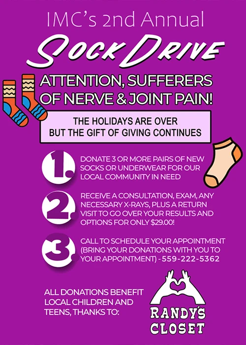 The holidays may be over, but the gift of giving continues with our 2nd Annual Sock Drive, going on from Monday, January 5 through Friday, January 23! There's something for both new and existing patients during this amazing promotion. For new patients, if you donate 3 new pairs of socks or underwear, you receive an examination, complete with all necessary X-rays, a consultation with our case manager, and a return appointment to go over your results and best options for only $29.00! For existing patients, bring in 3 new pairs of socks or underwear and receive a free Hydro Bed session and get exclusive discounts on maintenance packages! All donations will benefit local children and teens who live in Fresno County, thanks to Randy's Closet, a volunteer-based and nonprofit organization serving the needs of Fresno Unified School District students.